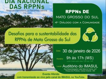 Em alusão ao Dia Nacional das Reservas Particulares do Patrimônio Natural (RPPNs), celebrado em 31 de janeiro, Mato Grosso do Sul sediará, no dia 30, o evento “Desafios para a Sustentabilidade das RPPNs de Mato Grosso do Sul”, que integra o 4º